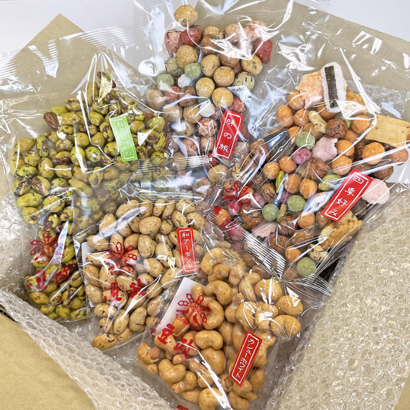 商品内容:味の旅200g(増量タイプ)・四季好み180g(増量タイプ)・わさびピーナッツ310g(増量タイプ)・和アーモンド120g・カシューホワイト120g