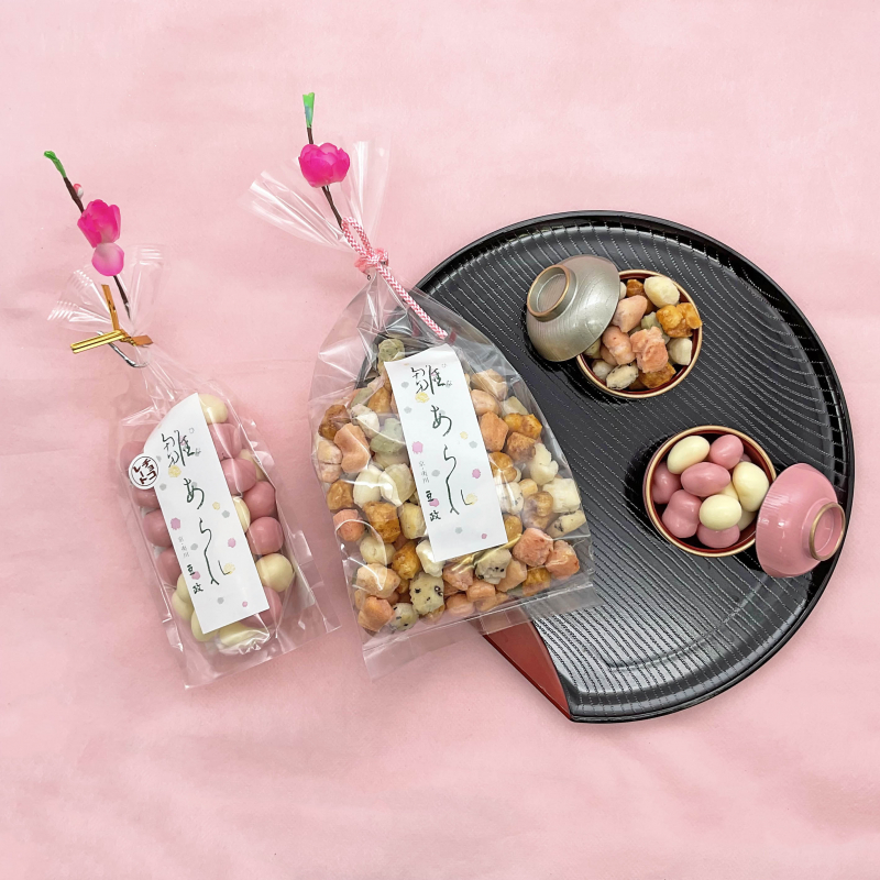 白焼きのふんわりしたあられにホワイトチョコとイチゴチョコを掛けた人気のひなあられです。